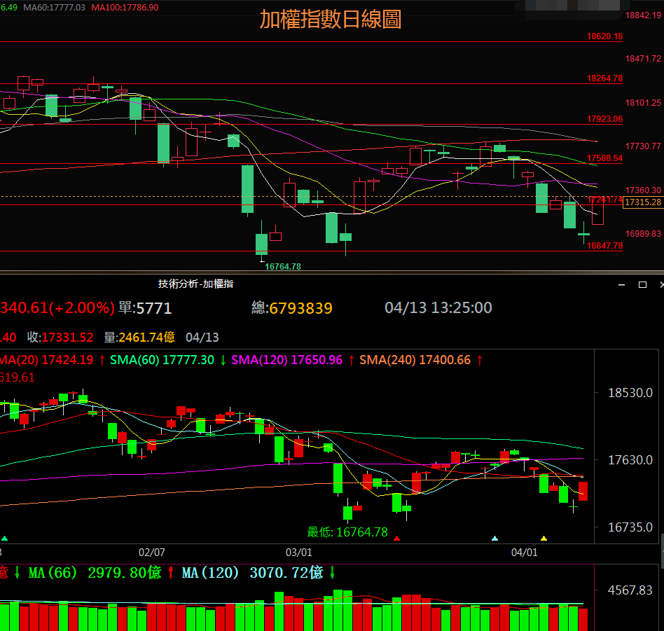 4月13日週三加權指數開高走高,縮量收出一根大紅K棒作用於17240~17380壓力區域,最高抵達17333.21點暫時處於多空分界位17380下方附近收於17301.65點,後市需等待目前所處多空分界位17380附近的方向選擇:有效上破17380則確立最新的反彈走勢,否則會再次下探或者整理。日線形態上看加權指數3月23日受壓100天均線位17740幾3月30日受壓100天均線位17775後形成雙頂下跌形態下破支撐區17100~17240,4月13日形成支撐位16848上方附近的欠支撐位反彈走勢並作用於壓力區17240~17380,後市需等待該壓力區的方向選擇。週線上看,週K線雙針探底60週均線位展開回彈走勢,但是受壓20週均線位後再次作用於60週均線位,週K線暫時形成一根未收線的上升蜻蜓線;MACD指標綠色柱狀線放大縮小後再次放大創新低不久又縮回,相對強弱指標短期RSI下破50中軸位幾長期RSI向上拐頭整理後又向下拐頭創新低不久又收回走平,表明目前行情為再次下探測試前低的整理走勢,需再次等待60週均線位附近的方向選擇,總體看週線級別目前是強勢區回檔多次測試60週均線位附近的方向待定走勢,目前上方壓力區為17240~17380,多空分界位為17380,下方支撐區為16710~16850,下方多空分界位為16710。