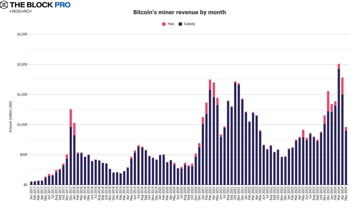 最近,随着符文與銘文熱潮暫緩,比特幣交易費用已經回落至與2023年中期類似的水平,意味着礦工收入已大幅銳減。根據The Block數據,由于第四次比特幣區塊獎勵減半,5月份礦工收入相較上個月下降了46%,降至9.63億美元,但與去年同期數據相近。