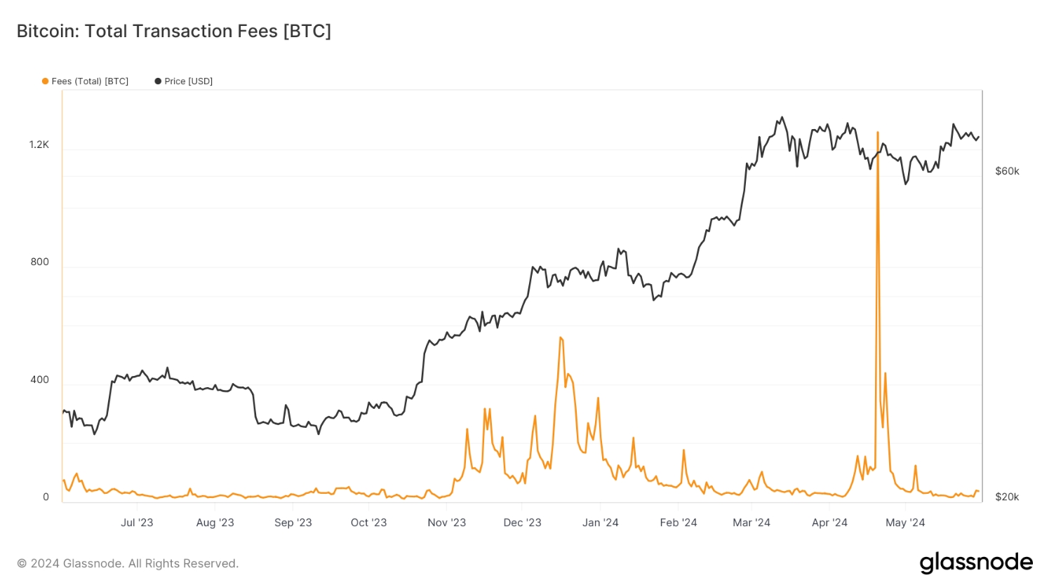 市場聚焦4月20日鏈上走勢,交易費用達到高峰1257.71枚比特幣,占當日礦工收入的75%以上。