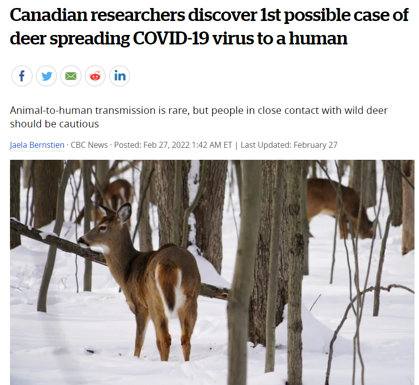 就在早些時候,加拿大也報告了全球首例“動物傳人”的情況,一頭鹿疑似將已變異的新冠病毒傳染給一名獵人。