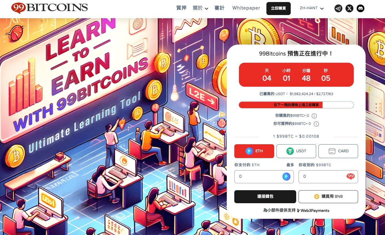 加密貨幣市場本年整體回暖,99Bitcoins正值此時推出預售活動,將教育與經濟收益相結合,用戶通過學習加密貨幣知識來賺取代幣。 99BTC的預售價格定為每代幣0.01美元,部分投資者預期其有增長100倍的潛力。
