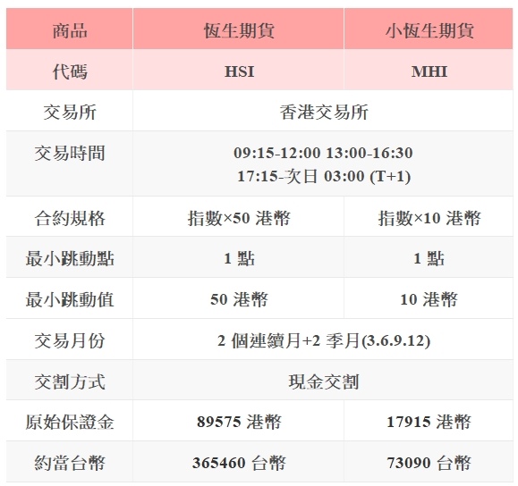 整理一下恆生期貨、小恆生期貨的合約規格、交易時間、最小跳動點、保證金