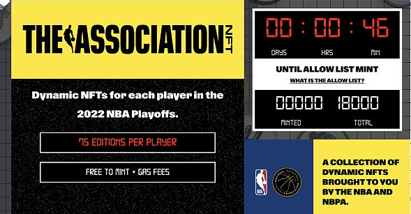 4月20日,NBA宣佈將於4月21日在乙太坊上推出名為The Association的動態NFT系列,白名單免費鑄造,總量18000枚。、