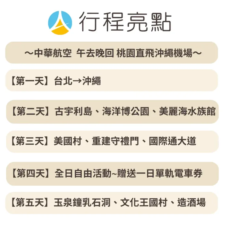🌊【海景一把抓】:除了入住面海房型外,這團行程還特別挑選了古宇利海洋塔、美麗海水族館及美國村等沖繩超人氣的賞海地點,想在五天內體驗被海包圍的感覺完全不成問題。