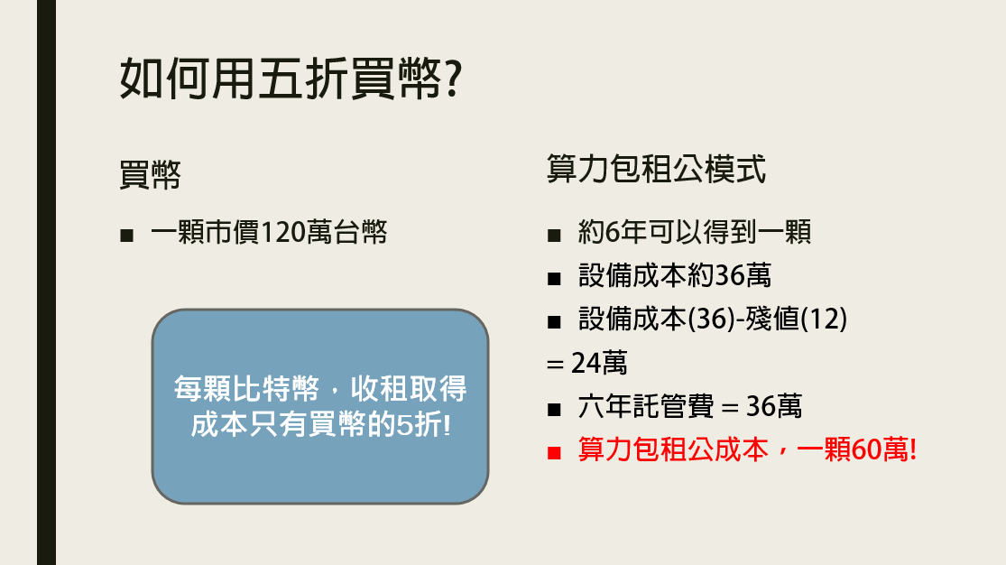 目前利用算力機挖礦的成本,約為2萬美金,遠低於目前的比特幣市價。利用算力機挖礦,等於打折買入比特幣。若要退場時,設備還有材質,風險更低。
