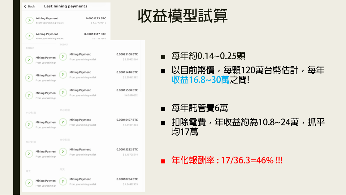 若比特幣價格維持現在價格120萬台幣,收益為96萬,報酬率71%