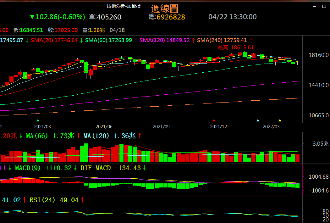 4月22日週五加權指數受隔夜美股下跌激勵開低走低,下探支撐位16848上方受到支撐出量開出一根較長下影線較小實體的上錘陰線,指數在區間【16848,17242】中下位附近受到支撐作用強力回升,延續弱勢區整理儲能的走勢,後市反彈概率較高。日線形態上看加權指數3月23日受壓100天均線位17740幾3月30日受壓100天均線位17775後形成雙頂下跌形態下破支撐區17100~17240,目前於16848支撐位上方附近展開強力回升有望在日線級別形成頭肩底和週線級別上形成雙底看漲形態而產生共振反彈走勢。週線上看,週K線雙針探底支撐區16710~16850展開回彈走勢後受壓20週均線位,再次作用於60週均線位並運行於60週均線位下方但未下破上月的低點16764.78,目前回彈受壓60週均線位縮量收出一根小實體紅十字星K線,暫時整理儲能運行中,後市看是否能重新站上60週均線位;MACD指標綠色柱狀線放大縮小後再次放大創新低,相對強弱指標短期RSI下破50中軸線幾長期RSI並創新低,雖然再次向上拐頭但最終受壓而走平,表明當前行情為下探後整理的走勢,暫時在支撐區16710~16850上方附近展開整理走勢,總體看週線級別目前是強勢區回檔多次測試支撐區16710~16850附近的整理走勢,目前上方壓力區為17240~17380,多空分界位為17380,下方支撐區為16710~16850,下方多空分界位為16710。