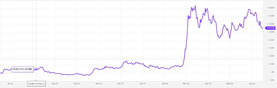 不過,除了加密貨幣市場的犬類熱潮之外,2024 年的meme 幣整體上也呈現出強勁的上升趨勢,如下圖所示的 MarketVector™ Meme 幣指數: