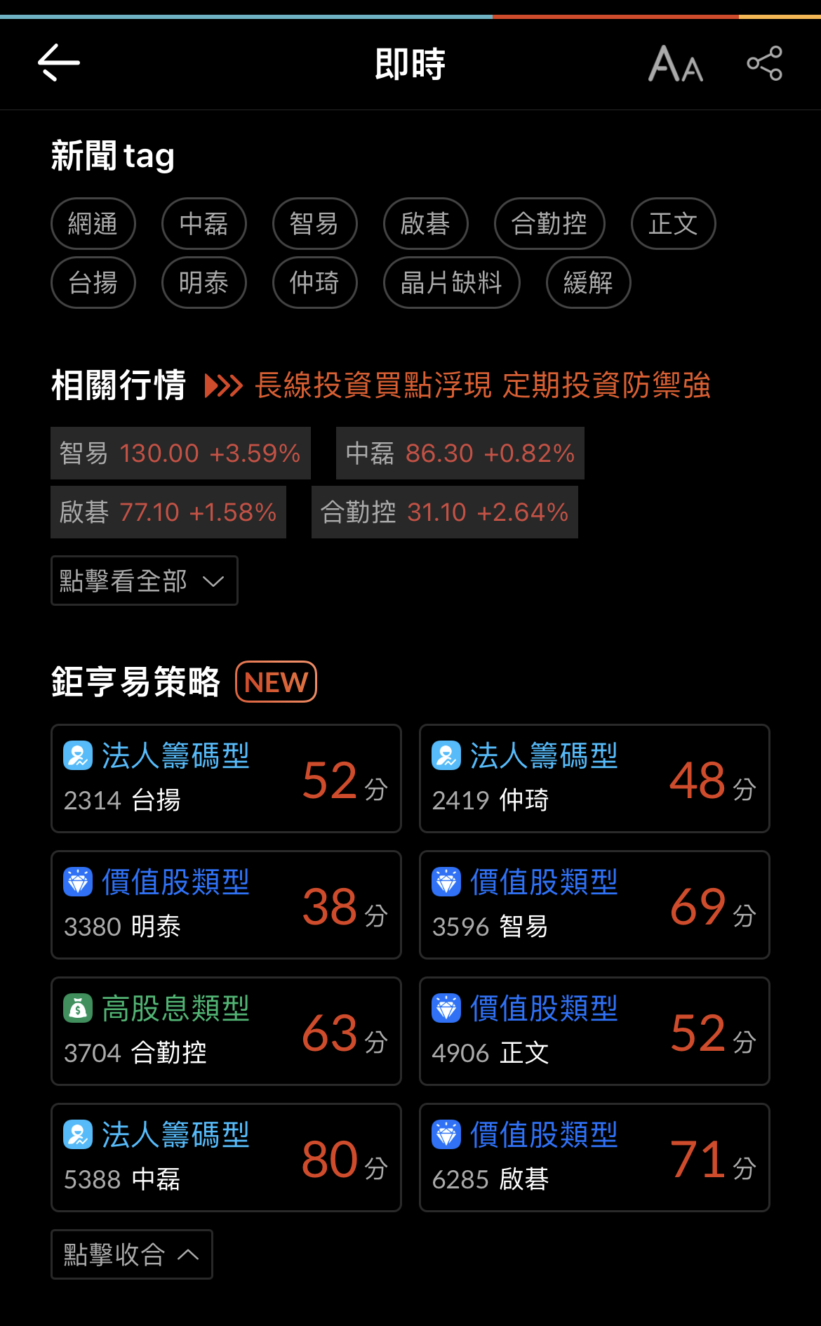 鉅亨易策略針對每一檔個股都有做不同面向的評分,對大家選擇標的更方便有效,不妨試試看吧,祝大家週末愉快,身體健康!