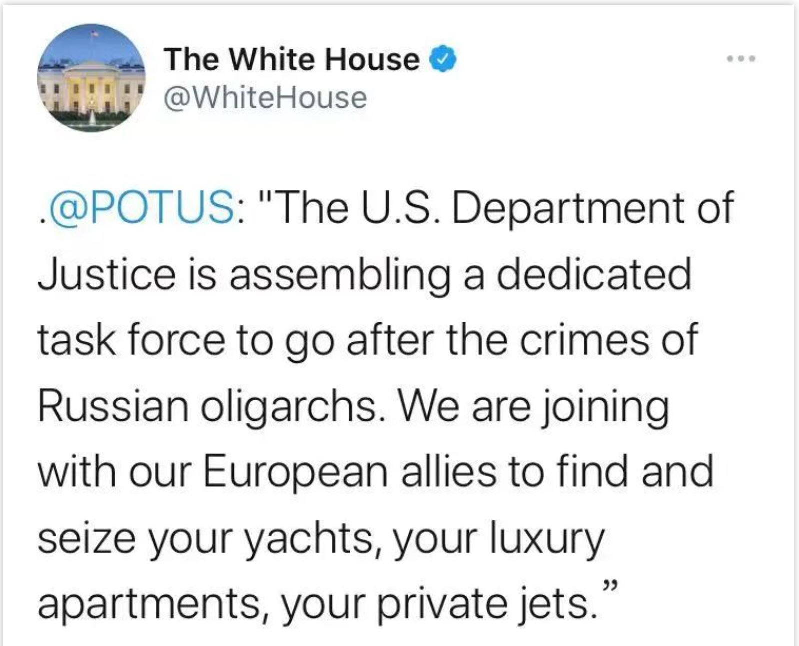 3月2日,美國白宮也在社交媒體宣稱,將啟動“多邊跨太平洋工作組”——“和美國的西方盟友們一起,識別、追捕和凍結俄富豪的遊艇、私人住宅、奢華飛機。”