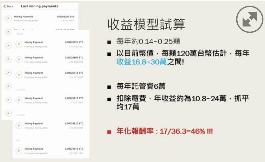 透過 <鉅亨 X 比特宇宙 算力包租公模式> 投資一台算力機,可以享有每天六次的收租次數,每年累積的顆數約 0.14~0.25 顆,以比特幣幣價 4 萬美金為例,每顆 120 萬台幣計算,扣除每年託管費 6 萬後,年化報酬將高達 40% 左右,聽起來不可思議,但卻是已發生 5 年的事實,上一輪加入的包租公已經在 2021 年幣圈牛市回收後,達到非常高的報酬。