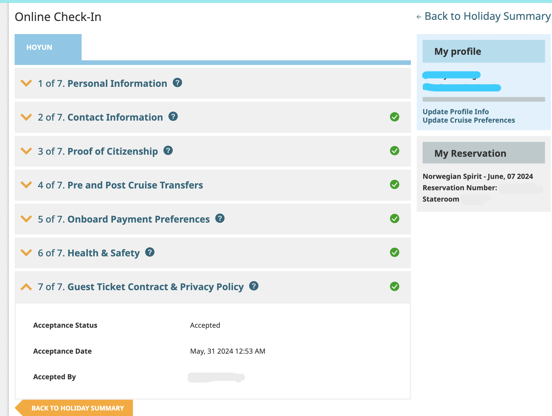 這艘郵輪比較特別的是在正式登船日前,需要先到挪威郵輪的網站事先完成線上報到手續。報到手續大致上是要求大家填寫個人資訊、郵輪上的支付方式以及當日的登船時間。完成資料填寫後,只要在一天後回到網站確認審核是否通過就完成這部分的程序了。
