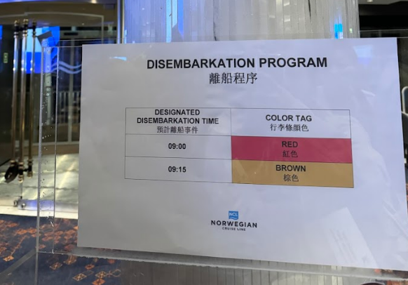 快樂的時光總是過得特別快,其實在航程的倒數第二天晚上就陸續開啟離船的準備程序。在這天需要提前先將需要托運的行李依照當日日報的公告至大廳領取相對應顏色的行李條,並在日報公告的指定行李收集時間將預計託運的個人物品放置到房間門口。