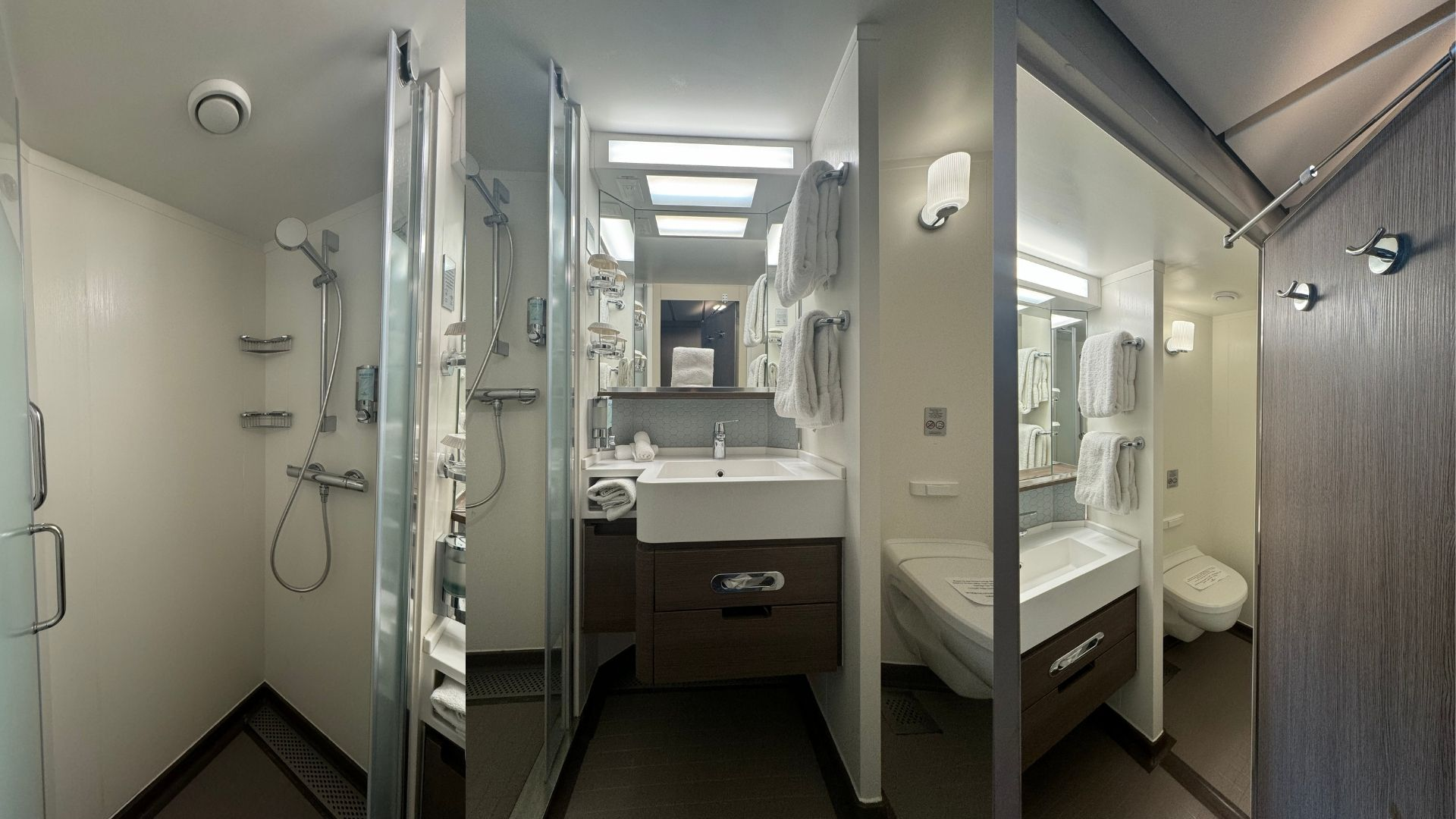 這個房型的浴室也可以說是一應俱全,除了基本的毛巾、沐浴乳、洗髮精外,還有乾溼分離的沐浴空間。浴室內的大小條毛巾房務人員也會每日進行更換,熱水量也相當充足,基本上完全不會因為是在郵輪上而造成太多不方便。