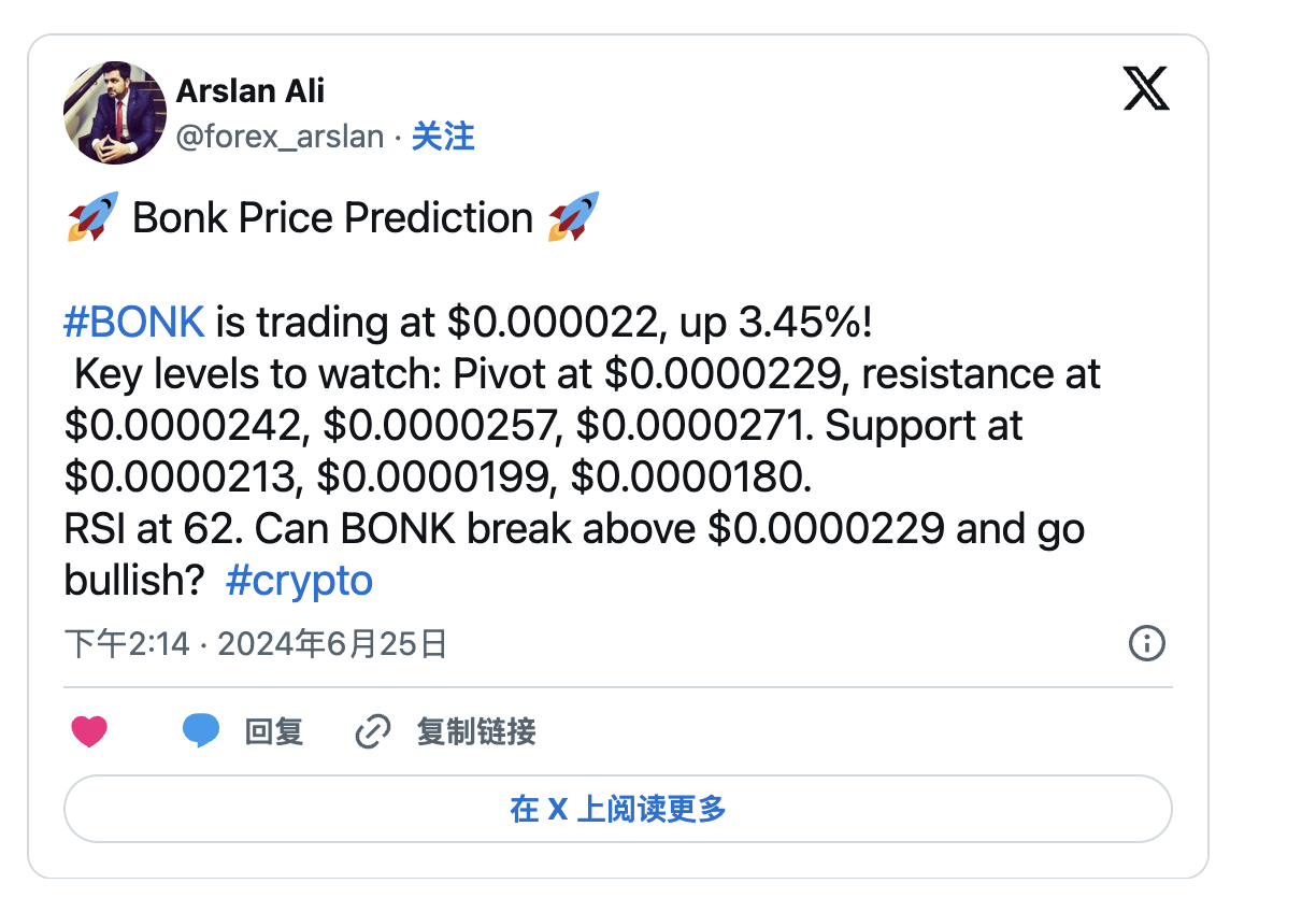 目前,BONK 的交易價格為$0.000022,上漲了3.45%。樞軸點標記在$0.0000229,這是交易者需要關注的關鍵水平。直接阻力位在$0.0000242,隨後的阻力位在$0.0000257和$0.0000271。如果價格突破樞軸點,這些阻力位表明潛在的上行目標。