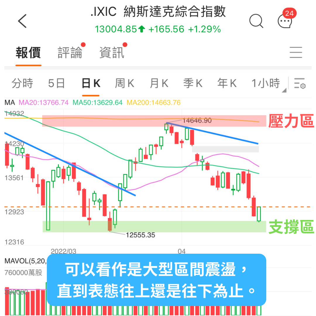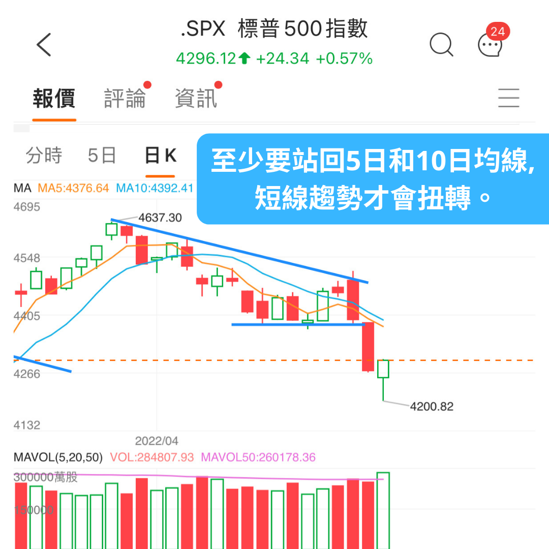 1. 昨晚美股低開後反彈,納指和標普都開始接近今年的低點,加上市場氣氛過度悲觀,樂觀的看法是標普能在4200附近站穩。然而,納指和標普至少要站回5日和10日均線,短期趨勢才會扭轉。從大趨勢來看,標普需要站回200日均線才會重回多方趨勢,而如果跌破今年的低點,則會再修正一隻腳。我們可以把現在的大盤趨勢看作是在200天線和今年低點之間震盪,沒有表態往上還是往下前,都會較難操作。我們耐心等待趨勢出來。