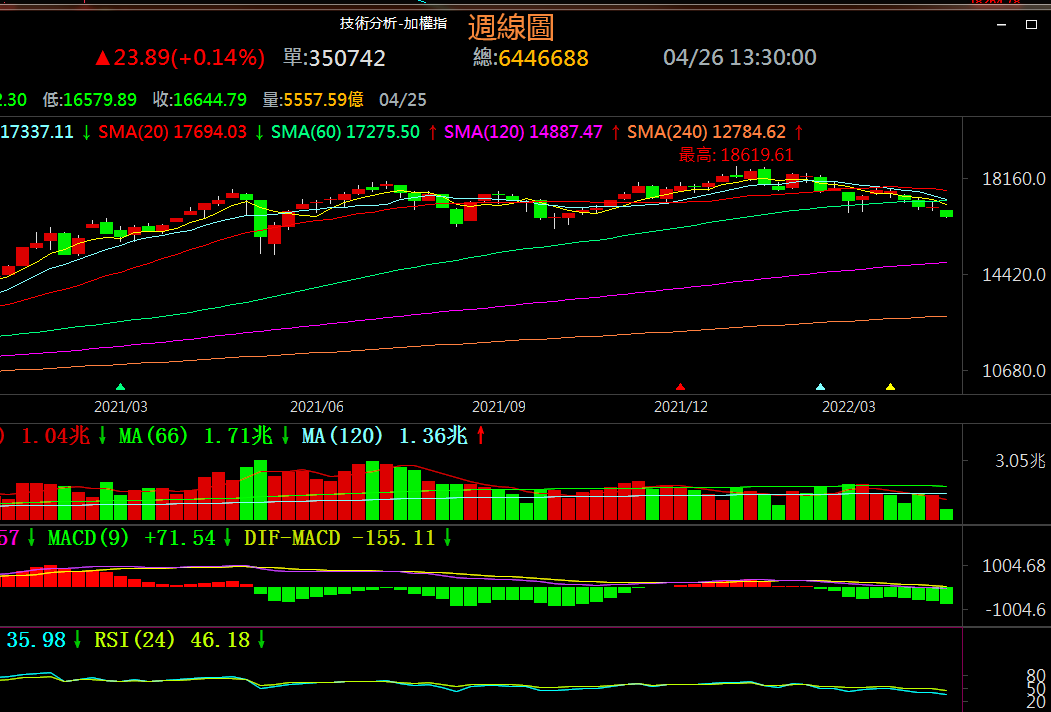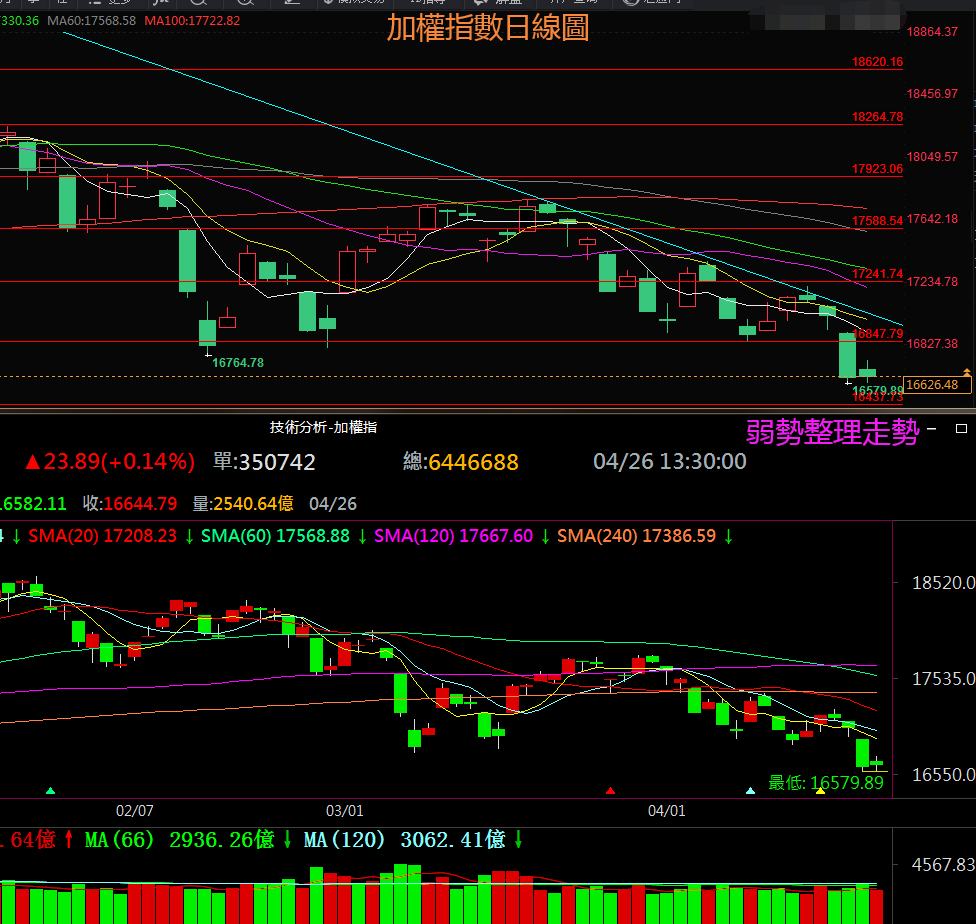 4月26日週二加權指數受隔夜美股反彈激勵開高走低但高於昨天收盤價23.89點,縮量開出一根偏整理的類十字星虛陰線;加權指數位於區間【16438,16848】中位16643附近整理運行,暫時虛假破位區間中位16643展開儲能整理,後市需等待區間中位16643或者區間下限16438附近選擇後續運行方向。日線形態上看加權指數構建頭肩底形態失敗,形成4月12日~25日的收斂三角形下破位形態。週線上看,週K線突破前低16764.78點,下方平台支撐區在16300~16333附近,後市需等待16300~16333支撐區或者其上方附近的方向選擇;MACD指標綠色柱狀線放大縮小後再次放大連創新低,相對強弱指標短期RSI下破50中軸線幾長期RSI連創新低,表明當前週線級別為弱勢整理後持續下跌的行情。目前上方壓力區為16850~16985,多空分界位為16985,下方支撐區為16300~16440,下方多空分界位為16300。