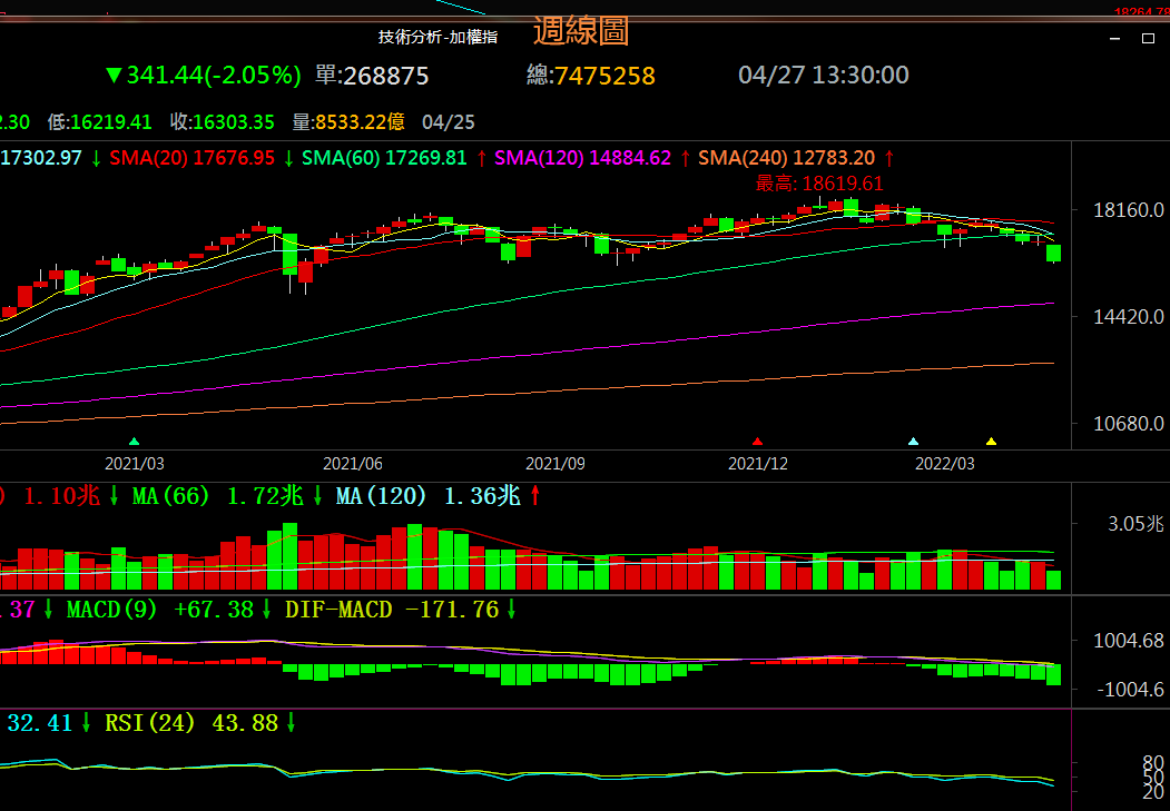 4月27日週三加權指數受隔夜美股再次大跌激勵跳空開低走低,出量開出一根偏整理的小實體陰線;暫時虛假破位多空分界位16300,後市需觀察月線收線是否下破16300,如果月線收線有效下破16300,後市大概率產生一輪較長週期的下跌走勢,否則無法有效下破16300有望止跌轉漲。形態上看加權指數構建日線級別頭肩底幾週線級別雙底形態失敗,形成日線級別4月12日~25日的收斂三角形下破位形態。週線上看,週K線突破前低16764.78點後最低點臨近去年10月份16162.17的低點,回彈後暫時虛假下破下方平台支撐區16300~16333,後市需等待16300~16333支撐區附近的方向選擇;MACD指標綠色柱狀線放大縮小後再次放大連創新低,相對強弱指標短期RSI下破50中軸線幾長期RSI連創新低,表明當前週線級別為弱勢整理後持續下跌的行情。目前上方壓力區為16850~16985,多空分界位為16985,下方支撐區為16300~16440,下方多空分界位為16300。