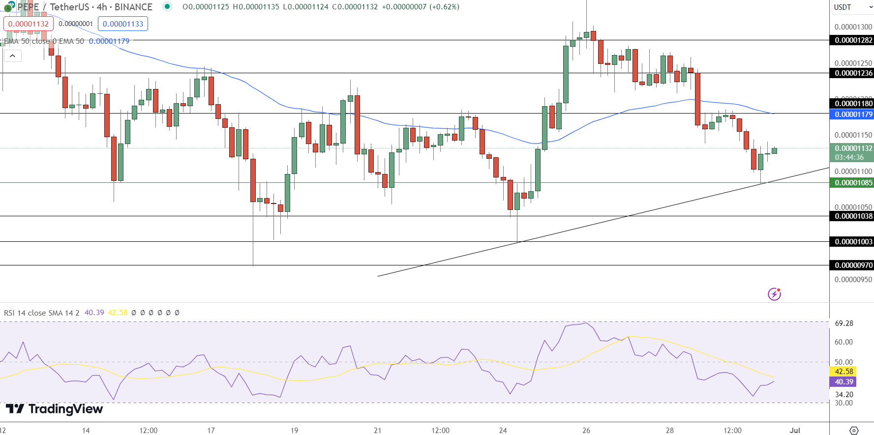 雖然當前價格趨勢是下行的,但上升趨勢線在$0.00001085附近提供了支撐。這表明下跌可能是暫時的,反彈可能即將到來。技術指標也提供了一些樂觀的信號。