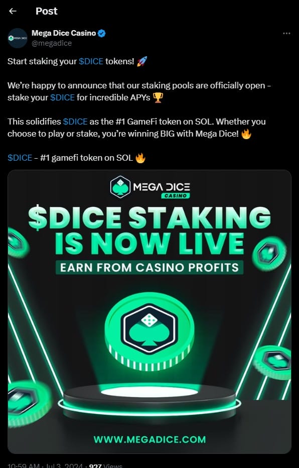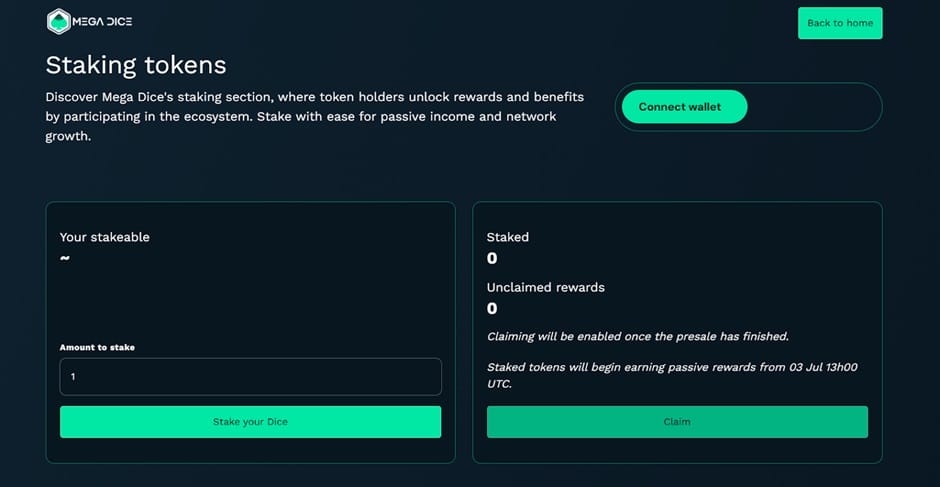Mega Dice今天推出了全新的质押功能,使得該代幣更加引人注目。現在,持有者可以輕鬆地開始從平台利潤中獲得 passvie income(被動收入)。