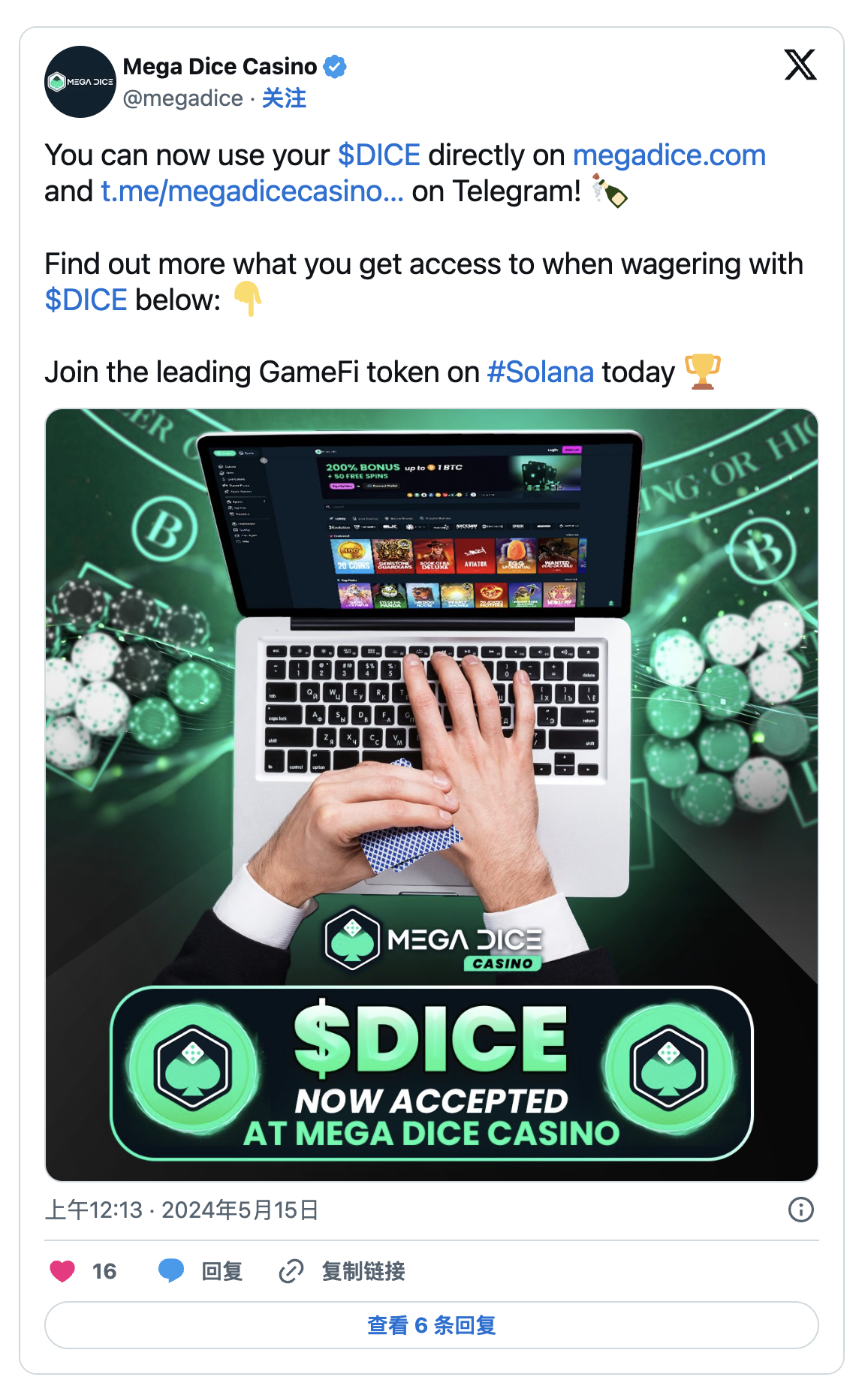 玩家還可以使用$DICE持有,通過Telegram的Mega Dice Casino機器人進行遊戲,該機器人已集成了Telegram錢包的功能。