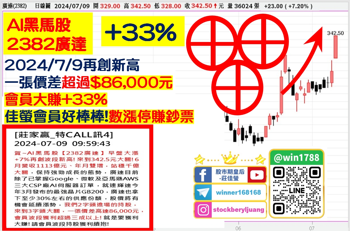 AI黑馬股(2382)廣達,再創波段新高!來到342.5元大關!佳螢會員領先進場!獲利+33%,附上簡訊為證!