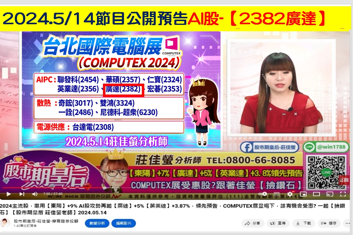 2024.5.14節目公開預告國際電腦展下的受惠股,AI-PC最有潛力的就是【2382廣達】,會員領先場後,獲利ING~