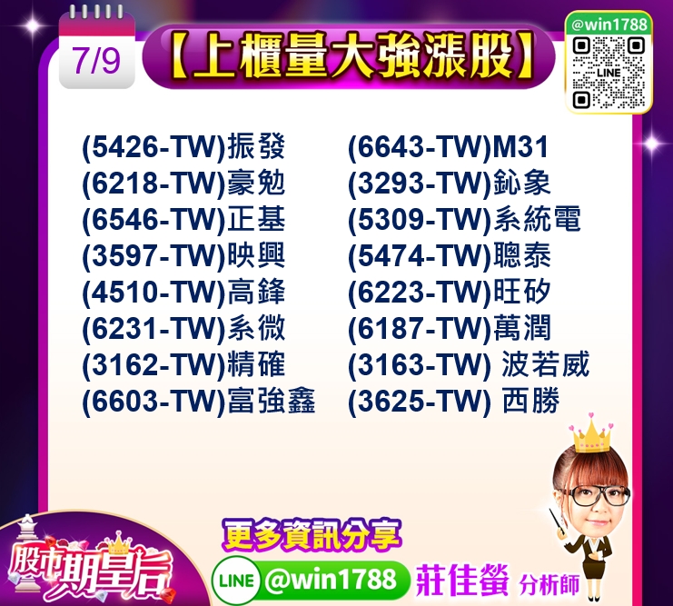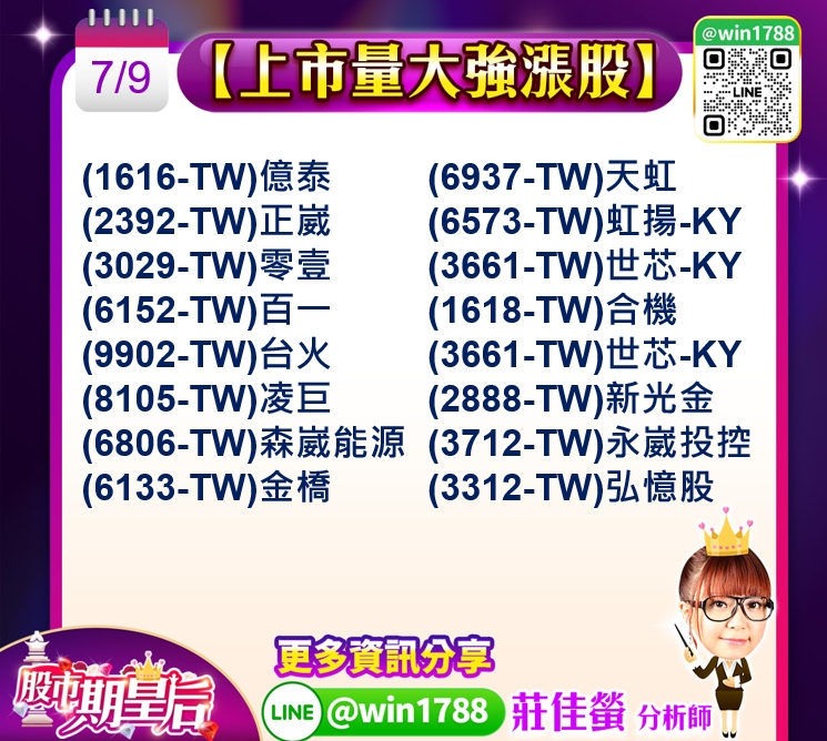 權值股方面,(2330-TW)台積電,上漲0.48%,收在1040元,再創收盤新高,外資昨日持續賣超台積電4,157張,連續兩個交易日賣超,總計兩天賣超9,374張,外資在台積電股價再創新高之際接連賣超,引發市場討論,但本土投信則連續七個交易日買超,成為台積電股價上升的重要推手;(2317-TW)鴻海,下跌0.44%,收在225.5元,鴻海表示,目前已進入下半年旺季期間,營運將逐漸加溫,展望本季營運,將有季增及年增的表現,法人看好,iPhone 16系列今年將搭上AI浪潮,推升出貨量進一步增長,主力代工廠鴻海受惠最大;(2454-TW)聯發科,上漲2.82%,收在1460元,聯發科7月4日除息,每股配發30.4元股息,僅僅歷經三個交易日,就於昨(8)日完成填息,表現相當強勢。