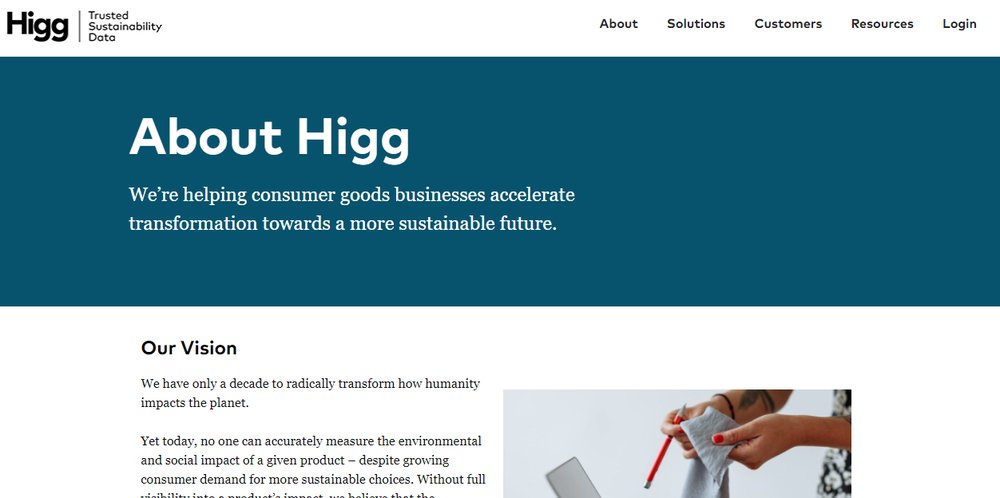 Higg是一家創立於2019年的非營利性技術公司,為時尚行業的環境及社會責任標準化評分系統Higg Index 開發工具軟件,包括測量工具、工廠評估工具、產品設計工具、數據管理工具、分析工具等等。值得一提的是,Higg 目前已建立了一個擁有超過30000個站點的工廠數據庫,其中接近一半在中國,大部分服務於服裝行業。