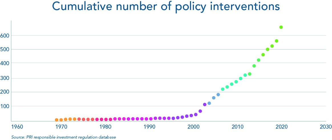過去幾年,ESG的監管急劇增加,促使企業首次考慮ESG風險。根據聯合國PRI責任投資法規資料庫。95%的法規政策是在2000年以後制定的,2010年之後有顯著成長(見下表)。