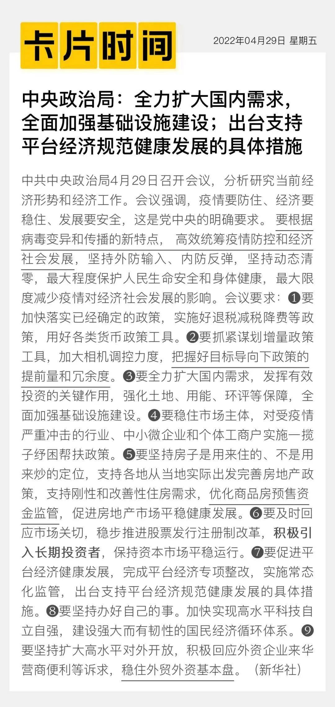 中共中央政治局4月29日召開會議,對於當前疫情防控政策、宏觀政策、房地產、平台經濟、資本市場,此次會議作出重要決策部署,釋放一系列重磅信號。這次會議外界解讀為“政策拐點”已至,官方表述看來,從去年的“反壟斷和防止資本無序擴張”,到今年年初的“加強反壟斷和反不正當競爭”,某種程度說明暫時完成了資本無序擴張的階段性整頓。