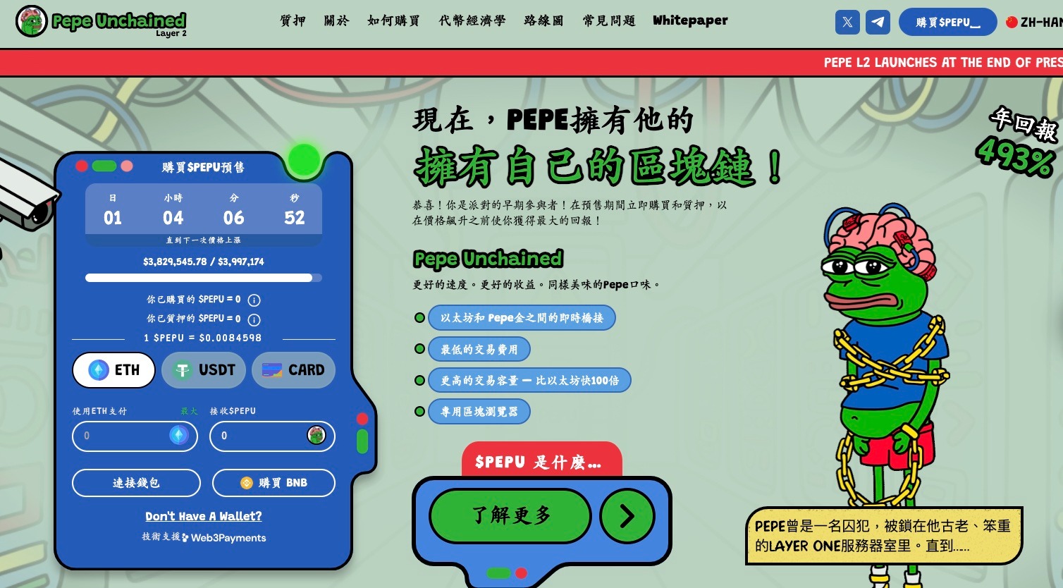 如果你準備支持真正的Pepe,可以訪問Pepe Unchained的網站,用ETH、USDT或BNB交換你的$PEPU代幣——信用卡也可以。