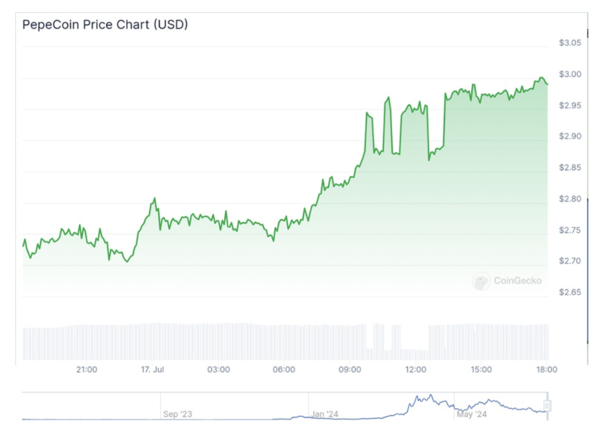 在過去的24小時內,$PEPECOIN大幅上漲,超越了$PEPE,分別上漲了10.8%和3%。